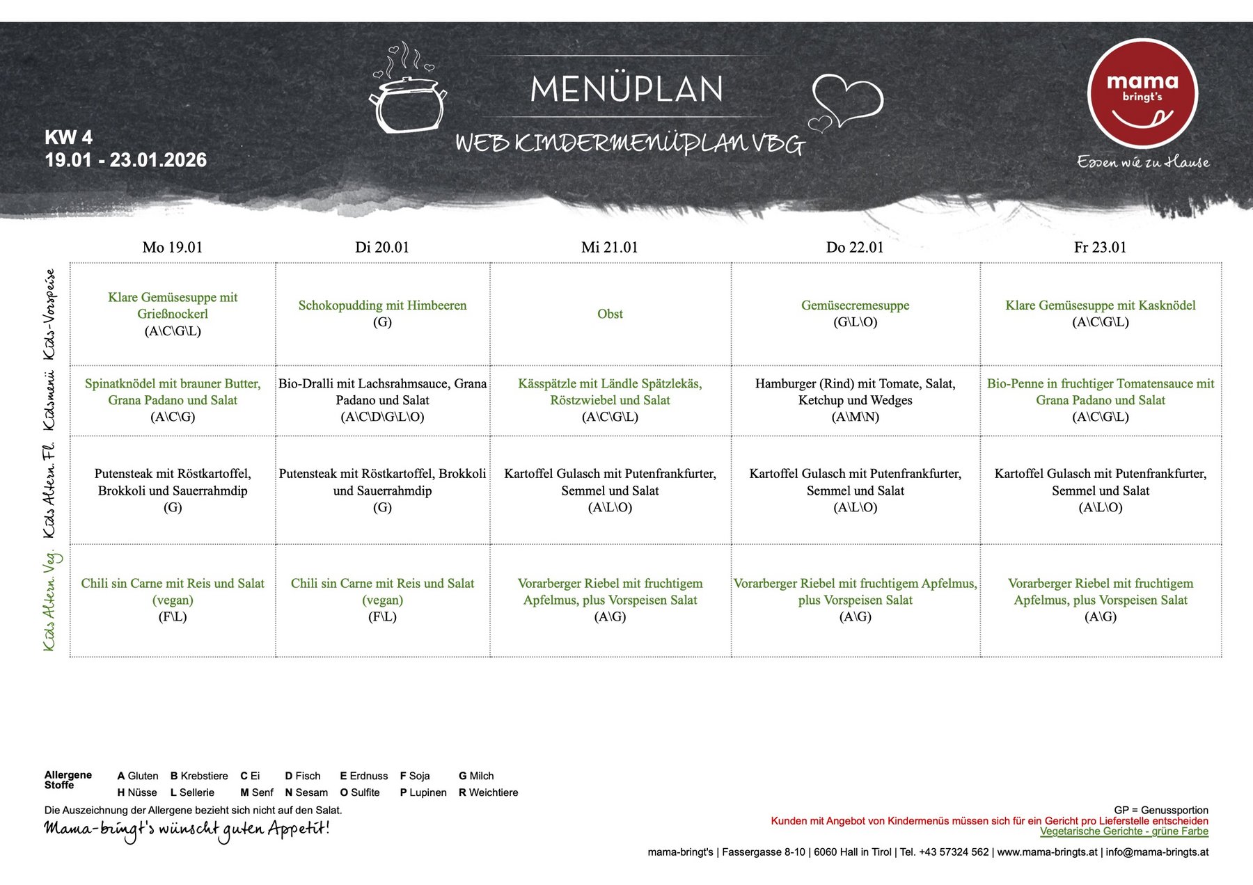 An die Mittelschulen wird keine Suppe geliefert. Als Menü pro Tag ist es uns nur möglich EINE Variante zu bestellen. Dies wird von uns so ausgewählt, wie es unserer Meinung nach von den Schülerinnen und Schülern am besten angenommen wird.
